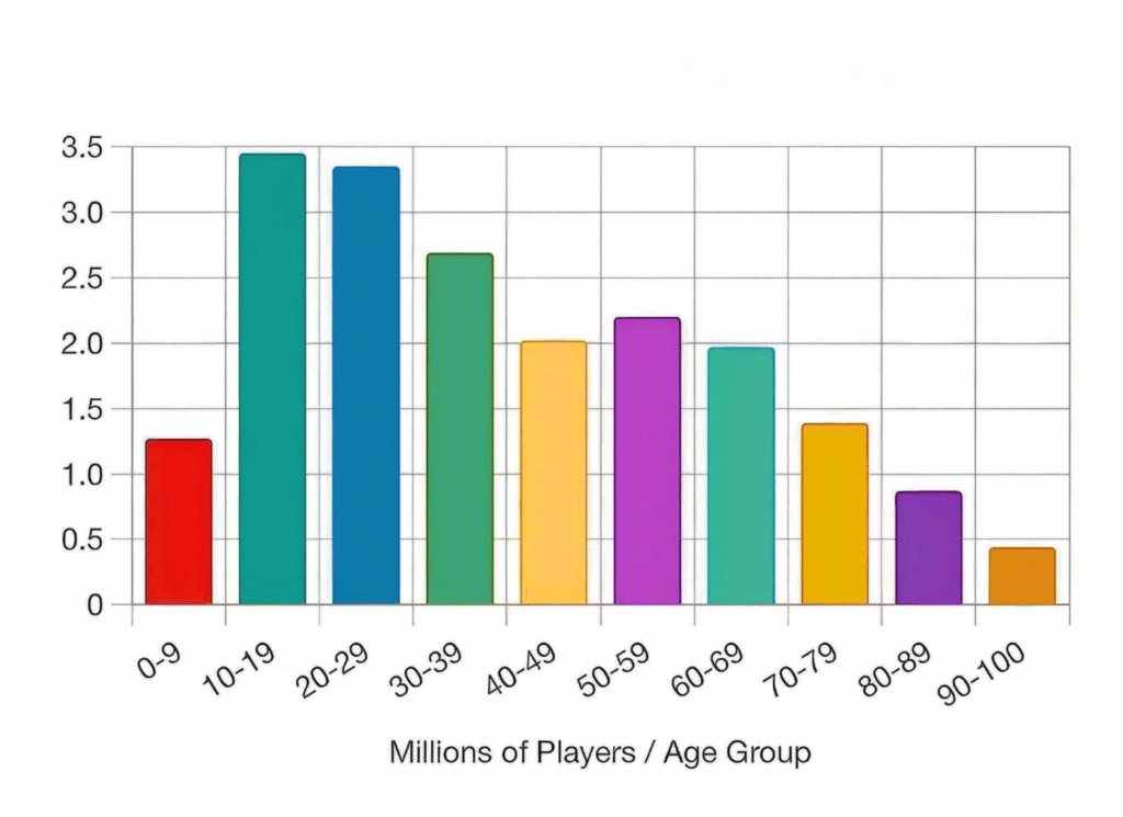 - 25-34 is the single largest group (~2.3M in 2023, scaled to ~2.8M now). 26
